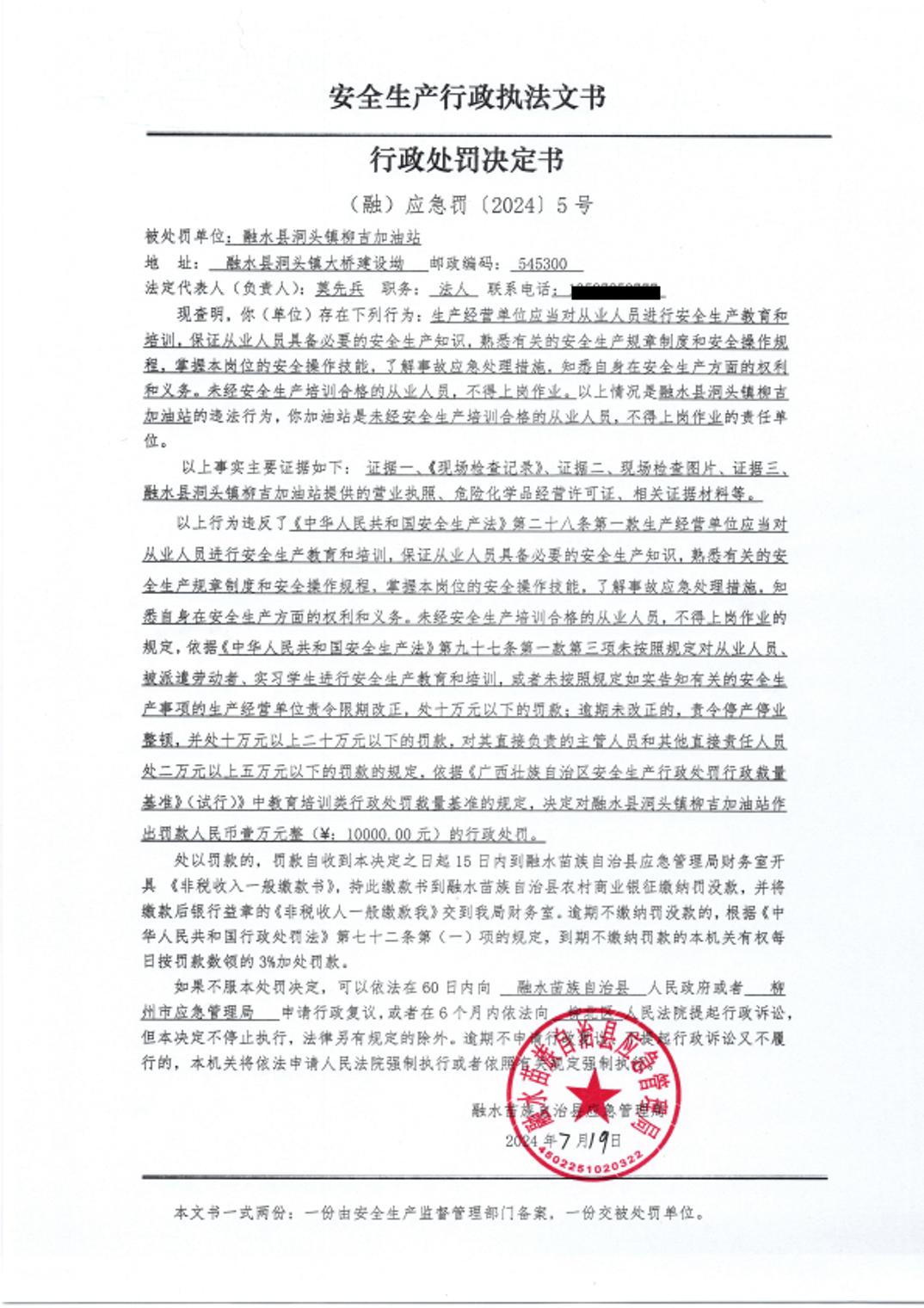 (融)应急案〔2024〕5号--融水县洞头镇柳吉加油站未经安全生产培训合格的从业人员上岗作业案的处罚公示