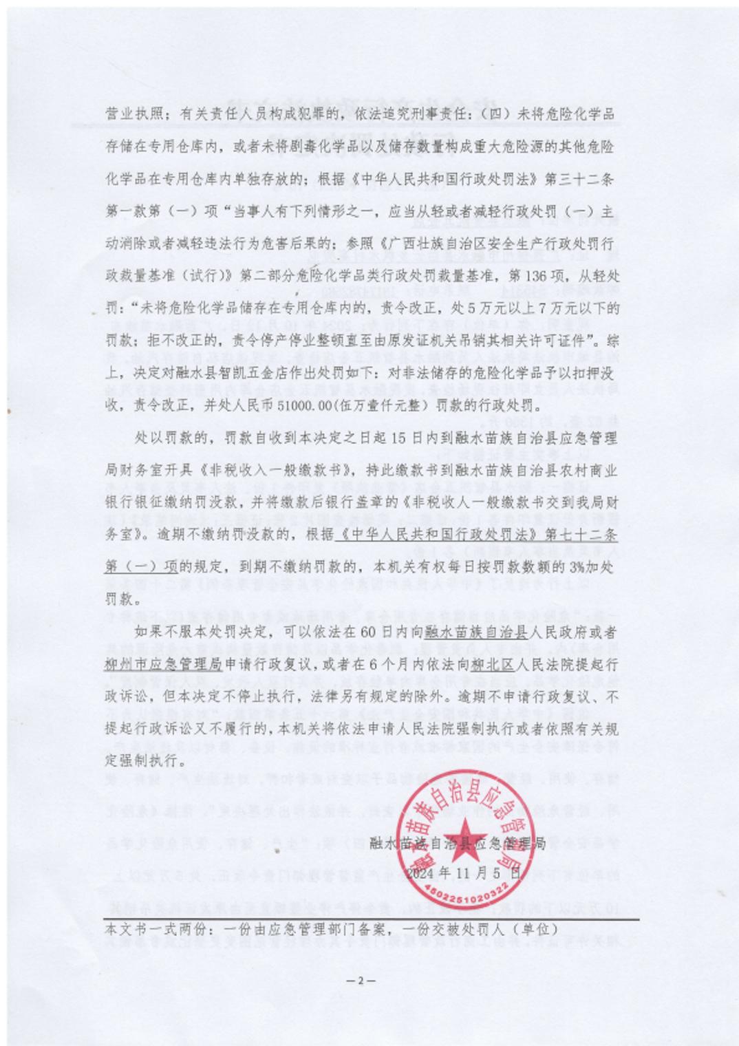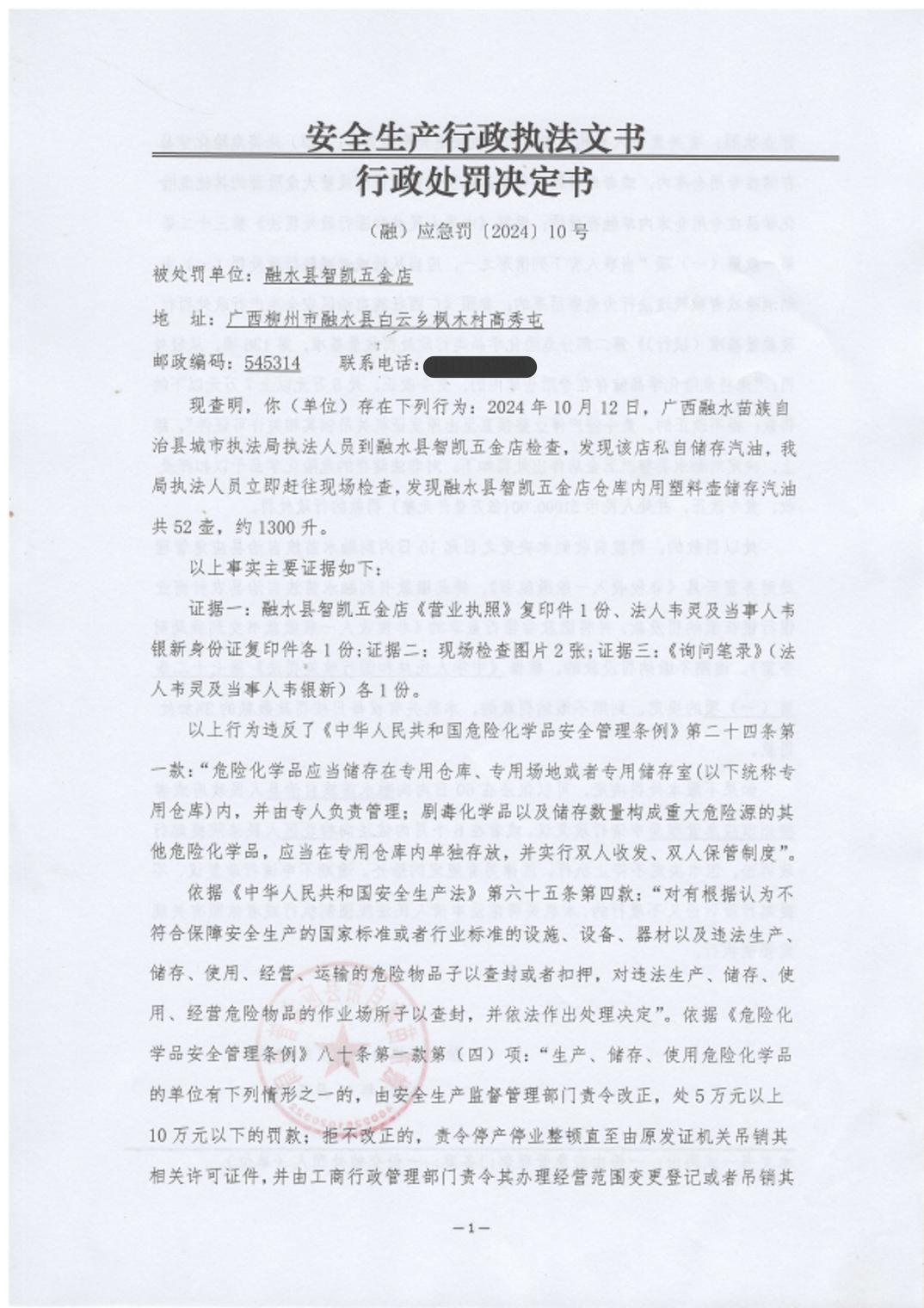 (融)应急案〔2024〕10号--融水县白云乡智凯五金店非法储存危险化学品案处罚公示