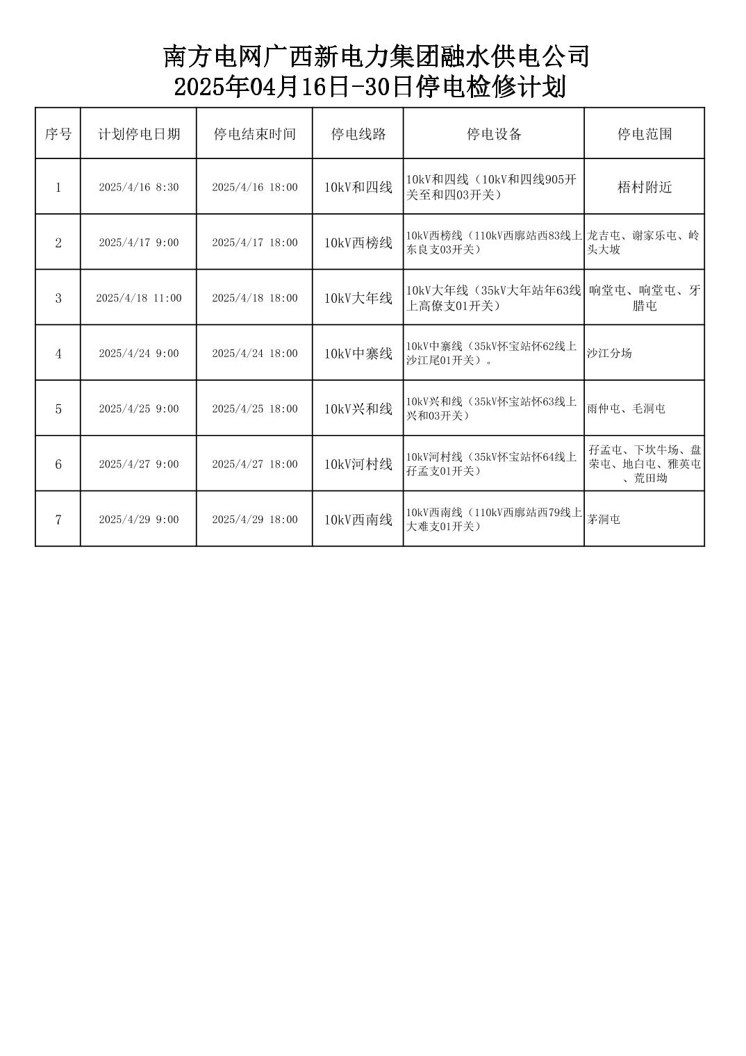南方电网广西新电力集团融水供电公司2025年04月16-30日停电检修计划