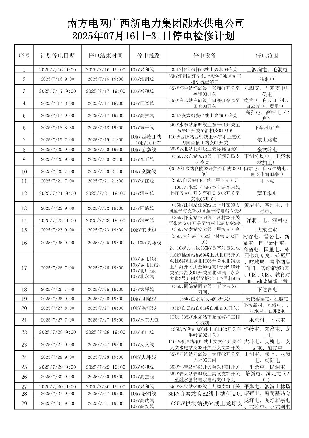 南方电网广西新电力集团融水供电公司2025年07月16日-31日停电检修计划