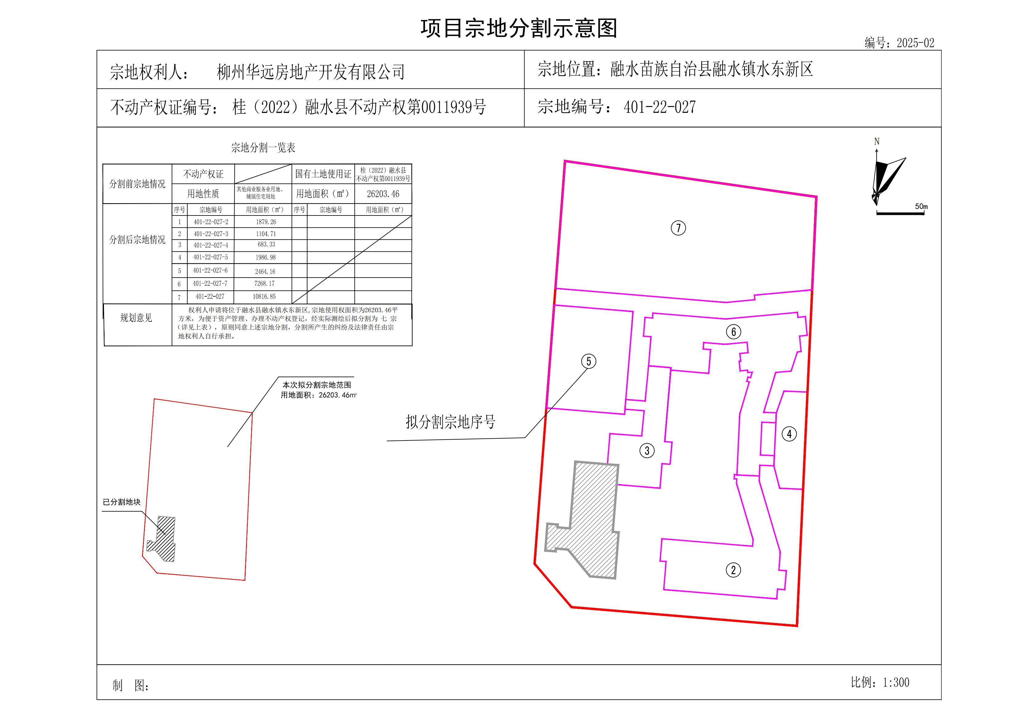 该宗用地不动产权证编号:桂(2022)融水县不动产权第0011939号,宗地编号:401-22-027,用地面积:26203.46㎡,为便于资产有效管理和房屋产权登记,现拟将该宗用地分割为七宗,分割后宗地二(401-22-027-2):用地面积:1879.26㎡;宗地三(401-22-027-3):用地面积:1104.71㎡;宗地四(401-22-027-4):用地面积:683.33㎡;宗地五(401-22-027-5):用地面积:1986.98㎡;宗地六(401-22-027-6):用地面积:2464.16㎡;宗地七(401-22-027-7):用地面积:7268.17㎡;扣除以上宗地后剩余宗地401-22-027:用地面积:10816.85㎡。