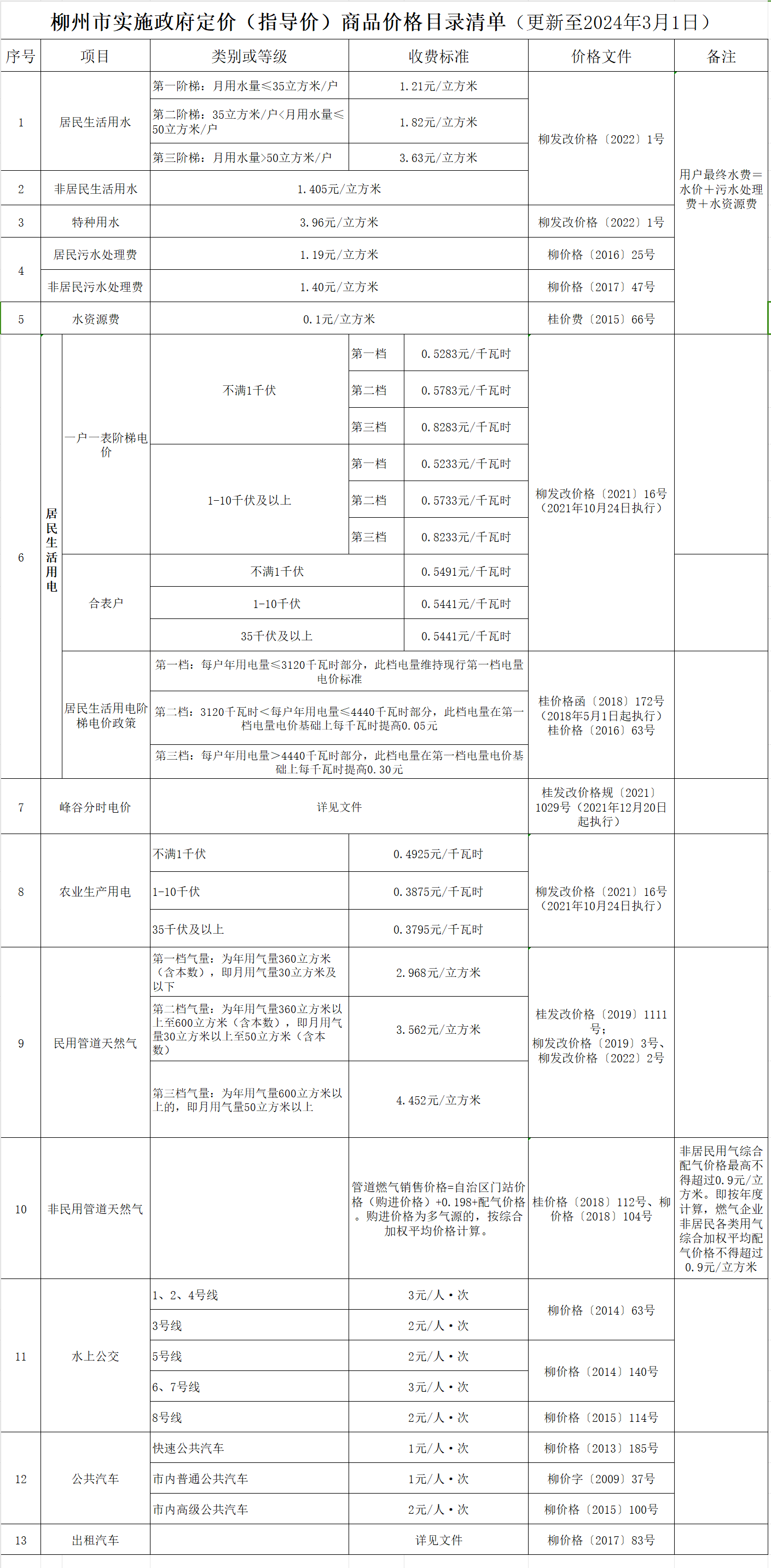 柳州市实施政府定价(指导价)商品价格目录清单(更新至2024年3月1日).xls.xls