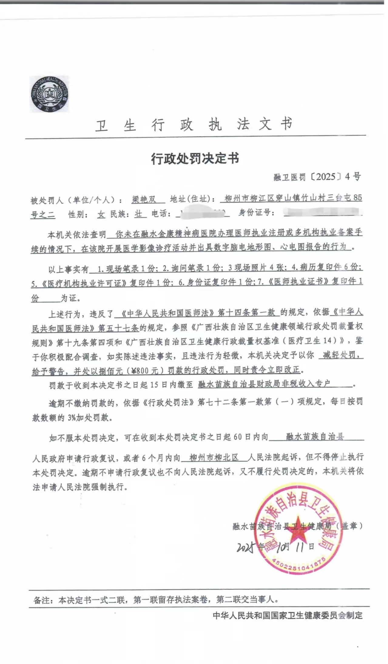 融卫医罚〔2025〕4号行政处罚决定书