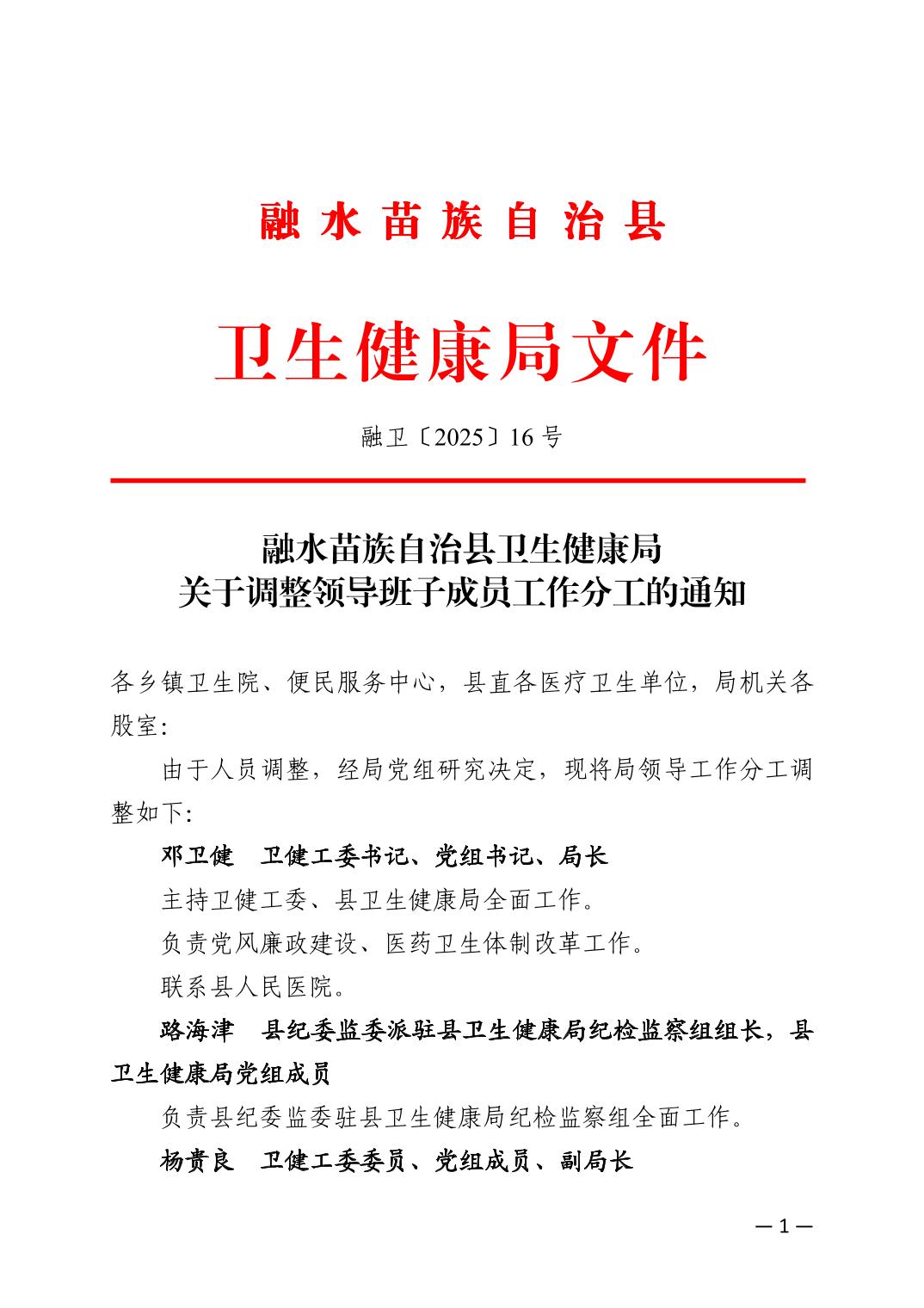融卫〔2025〕16号融水苗族自治县卫生健康局关于调整领导班子成员工作分工的通知
