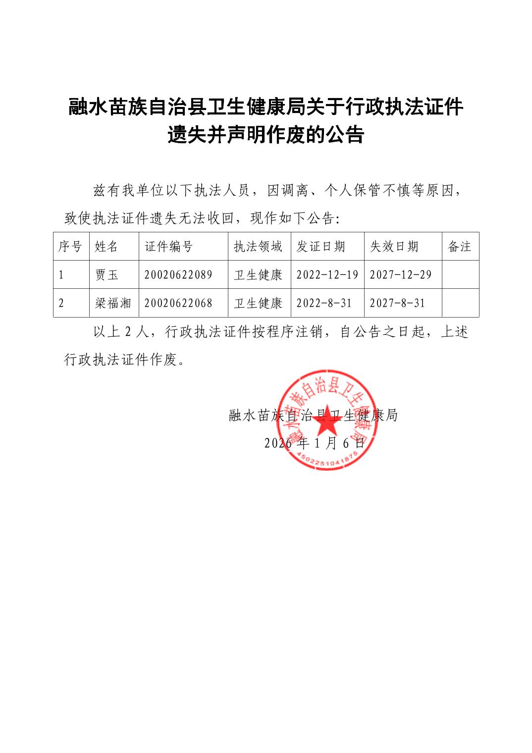 融水苗族自治县卫生健康局关于行政执法证件遗失并声明作废的公告