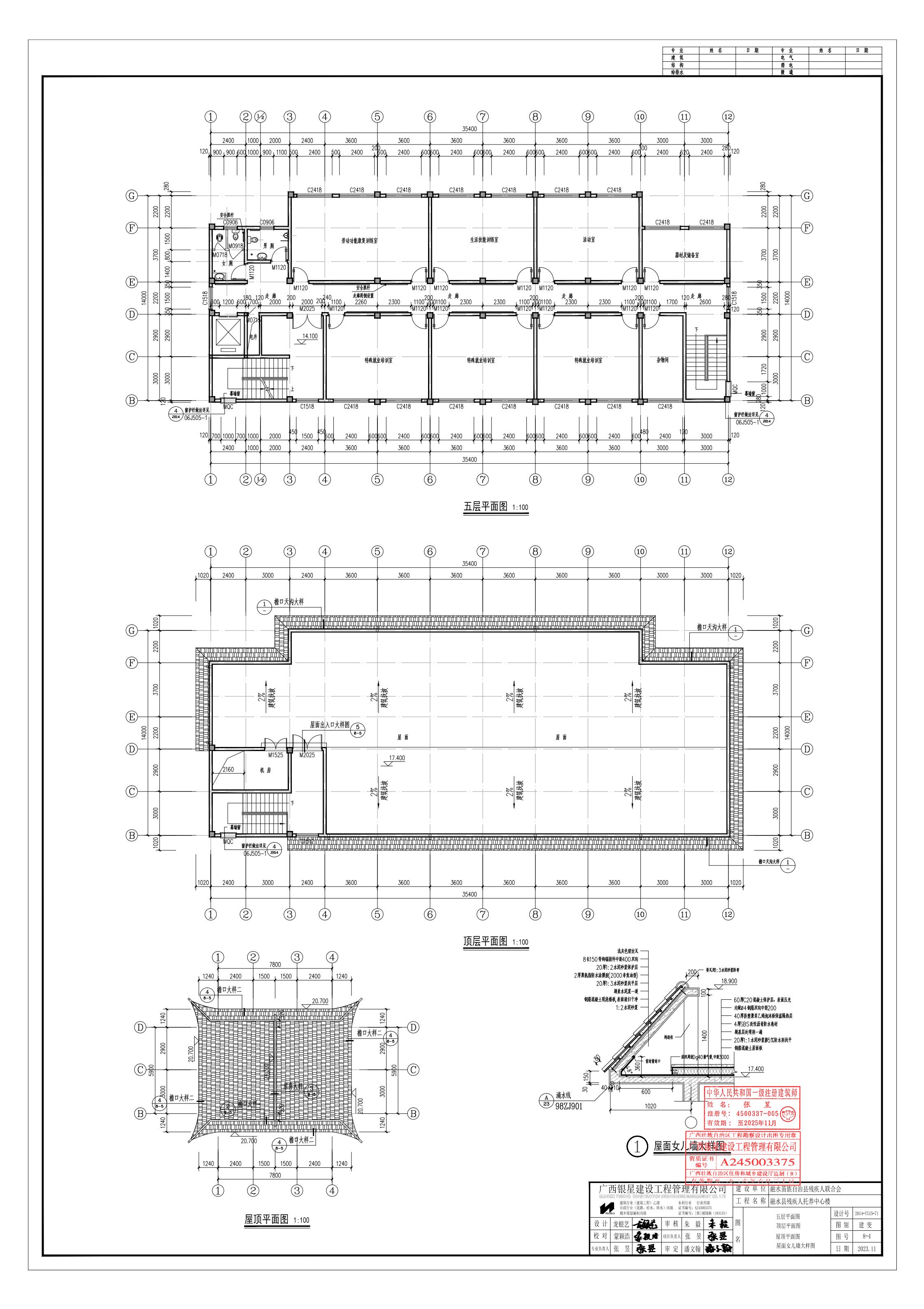 (二)原方案顶层平图中檐口雨棚仅至B轴与(4)轴交界处,外挑檐口雨棚未直接与建筑主体柱子连接,业主对建筑的整体稳固,施工便捷考虑,顶层檐口雨棚延伸至B轴与(3)轴交界处。由于檐口延伸至B轴与(3)轴交界处,原位于B轴与(3)-(4)轴交界处的窗C1518(宽1.5米高1.8米)的窗台抬高,此窗高度变小,窗变为C1512(宽1.5米高1.2米)。