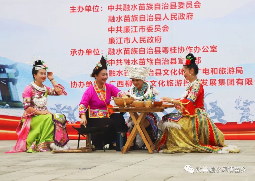 相关部门举行了民族风情表演,《敬酒歌》《原生态歌曲》《苗族盛装秀》《苗族打油茶》等节目轮番上演,精彩纷呈,让参与此次活动的商客感受融水非遗文化的魅力。