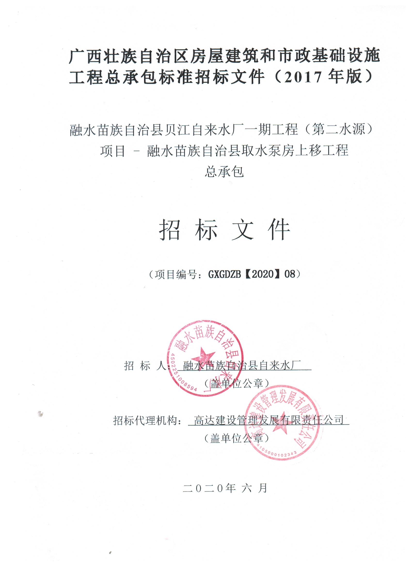 招标人: 融水苗族自治县自来水厂 招标代理机构:高达建设管理发展有限责任公司 地址:融水苗族自治县融水镇细鱼路48号 地址:柳州市河东路1号秀景园小区5-4号三层 联系人:刘工 联系人:谭工 电话:0772-5122516 电话:0772-2137008 传真:0772-2137008 2020年 6 月 19 日 |