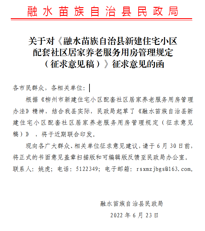 关于对《融水苗族自治县新建住宅小区配套社区居家养老服务用房管理规定(征求意见稿)》征求意见的函