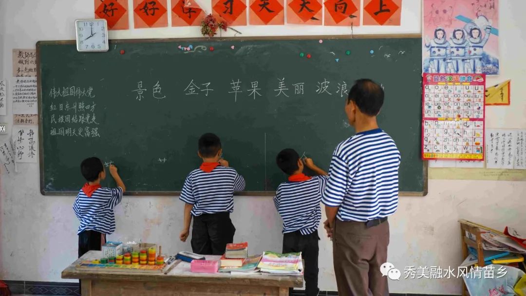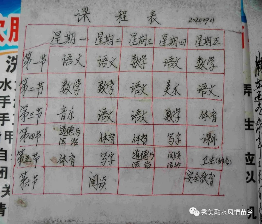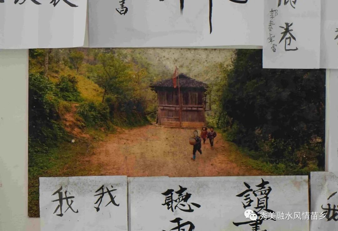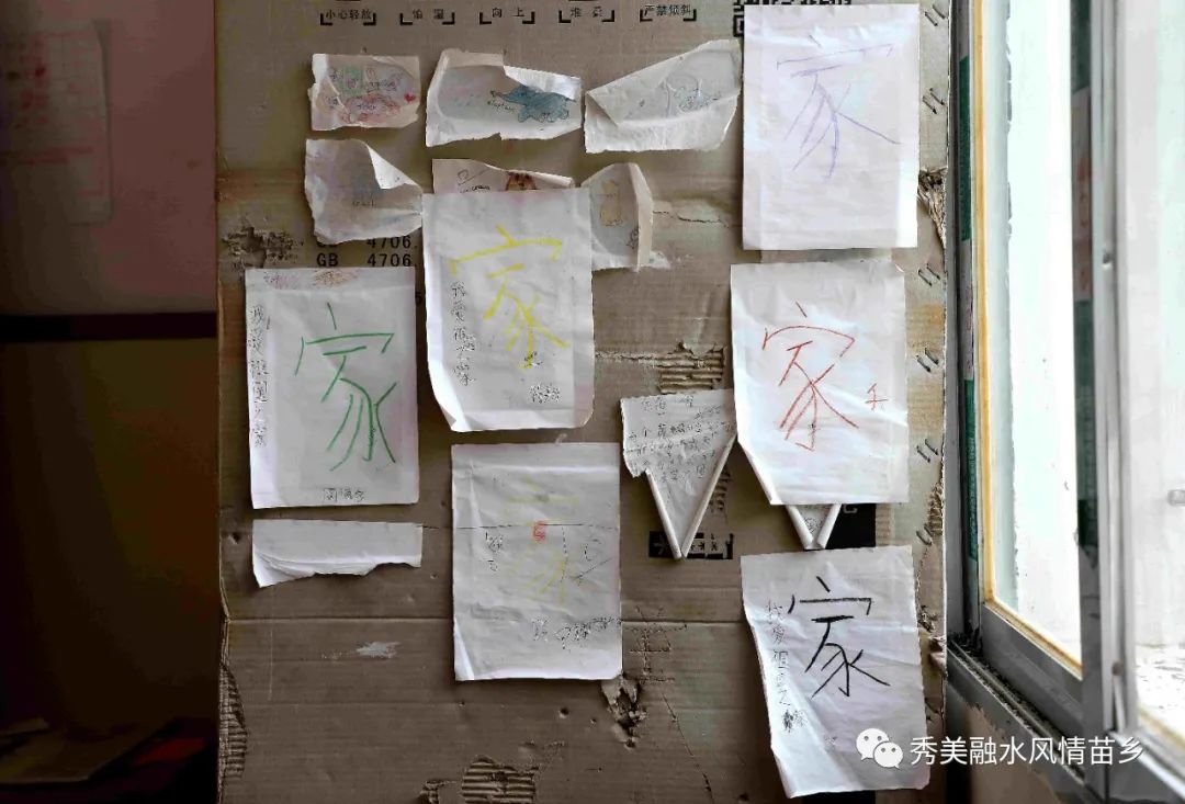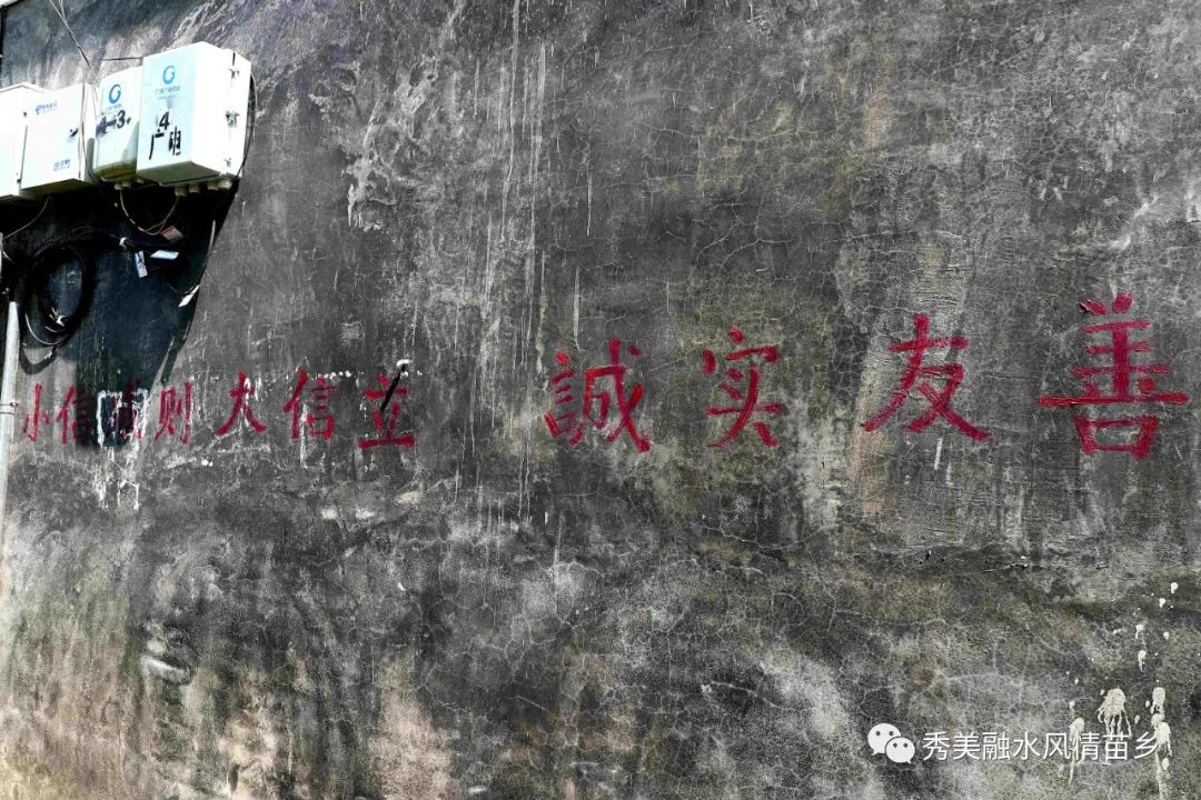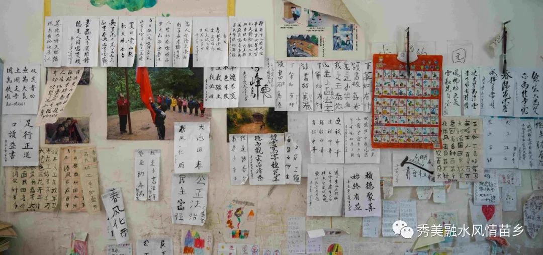 ▲学校的灰墙上是周宏军老师手写的宣传标语。