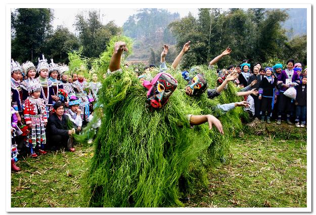 坡会上身披芒草、头带面具的芒蒿(摄影:龙涛)