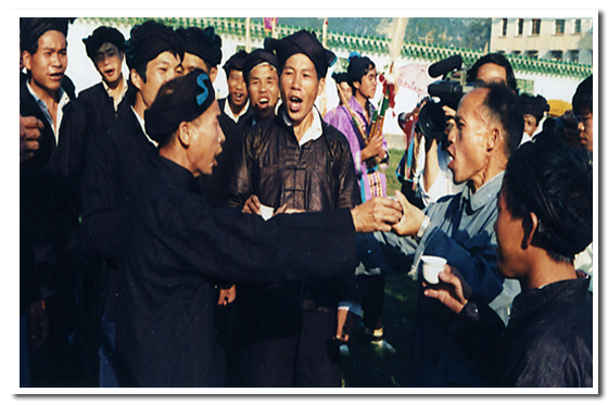 喊酒,是古时流传下来的。相传元宝山下住着一位努老汉,他酿的酒远近有名。有一次,努老汉邀请一帮亲朋好友到家喝酒,他拿出藏了九九八十一天的糯米甜酒来款待,酒色橙黄,香甜醇厚,大家都夸是好酒。这时一个小伙子站起来说:“努老伯酿的酒太好了,现在我们嘴巴吃到了,鼻子闻到了,眼睛看见了,就差耳朵还没有听见,我们为何不在喝酒时,高喊几声,让耳朵也听见呢?”大伙都说这做法好,于是大伙起立,手捧酒碗,齐声高喊三声“呀――呜,呀――呜”(苗语,“好呀”)。喊声洪亮整齐且有韵律,震撼着木楼,苗家弟兄觉得酒更甜,意更浓,情更切了。从此,“喊酒”的做法便流传开来,逐渐成为苗家人喝酒助兴的一种特有而风趣的习俗。