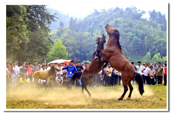 斗马,是苗族群众最喜爱的一项民间娱乐活动。在融水苗乡盛行已有几百年的历史。斗马是融水苗族自治县苗族同胞特别喜好的文娱活动,是全国民族民间独一无二的娱乐活动项目,融水也因此被誉为“中国斗马之乡”。苗族斗马已有五百多年的历史,传说当年苗王嫁女时,曾采用斗马的形式来选婿在当时的苗族社会里逐步效仿。其初衷是一种婚姻的裁决形式,如果几个小伙子同时追求一个姑娘,寨老就组织小伙子们进行斗马比赛,获胜的马主赢得姑娘。苗族认为这既是十分公开、公平、公正的较量,又不伤彼此的和气。如今斗马已经演变成为苗族的传统体育项目,并在各种重大节庆活动中以表演的形式亮相,供人们欣赏。