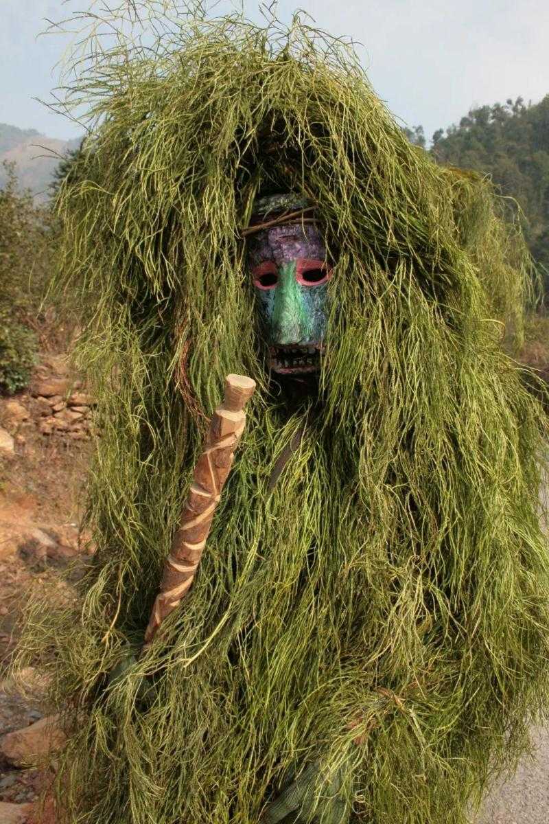芒蒿面具:制作芒蒿面具,选用一种苗语叫“都金汤”的树木精心刻制,一股宽约20公分,长约30公分,以扮演者脸型进行适当调整。用棕树皮做胡须饰于面具上。原来用锅灰涂抹成各种形态,后用油漆描画,以白色勾画眼眶、绿色涂抹鼻子、红色涂画嘴巴等。面具以夸张手法表现各路鬼神,神态生动,喜怒哀乐兼备。