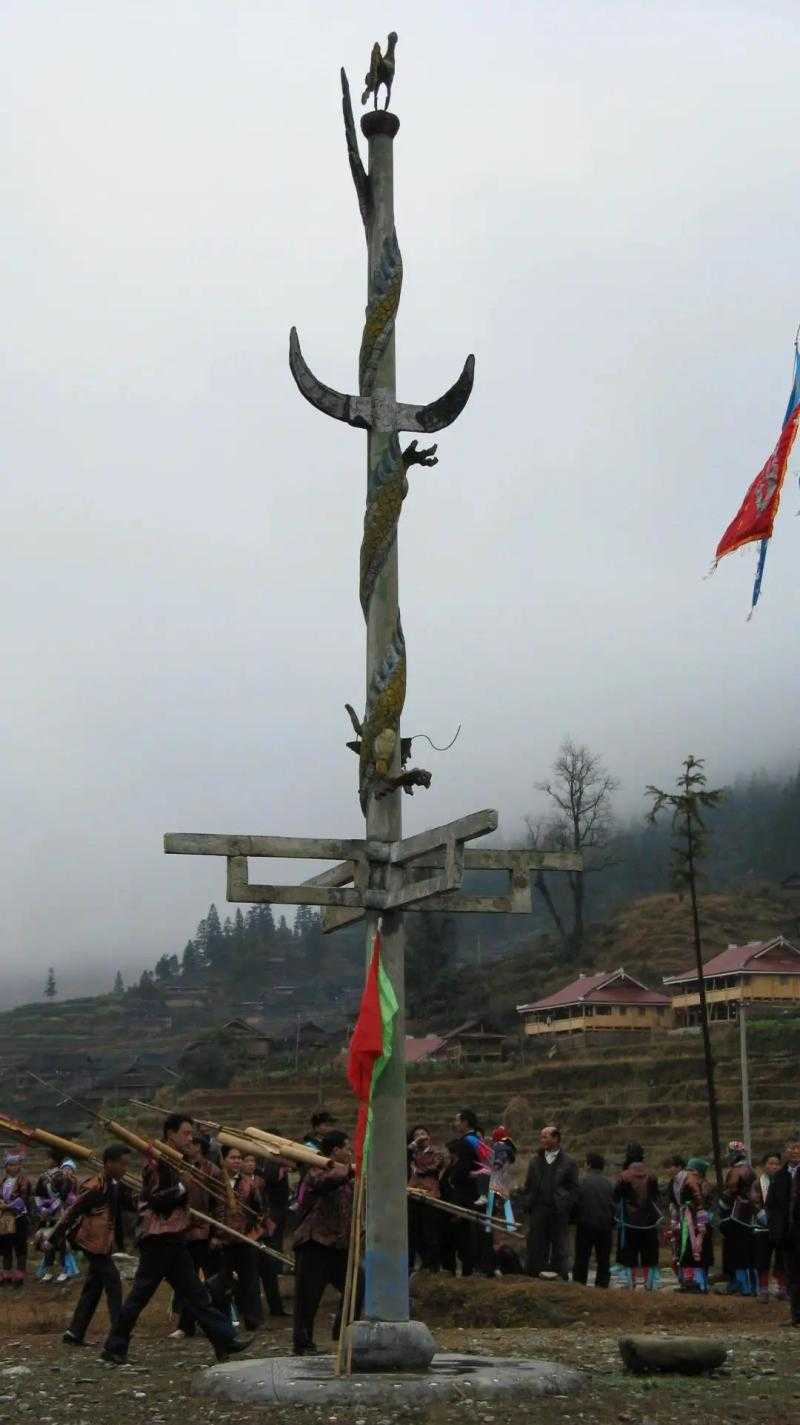 芦笙柱:举办坡会时,身着盛装的苗家男女老少云集在芦笙坪上,环绕着坪中央的一根高柱翩翩起舞。这根柱子就叫芦笙柱,苗语叫“栋嘎”,它是苗族吉祥的象征。芦笙柱用杉木制作,高10-20米,底部直径为30公分,尾径为16-20公分,其造型根据民间传说,顶部雕刻苗族人民喜爱的鸟兽,离顶部2米许,装一对木制水牛角,下半部是一对横杆,柱身色彩斑斓,绘龙画凤。制作芦笙柱要请手艺最好的木匠,由寨佬监制。若干年还要更换新的芦笙柱。竖立芦笙柱时要举行隆重的祭祀仪式。
