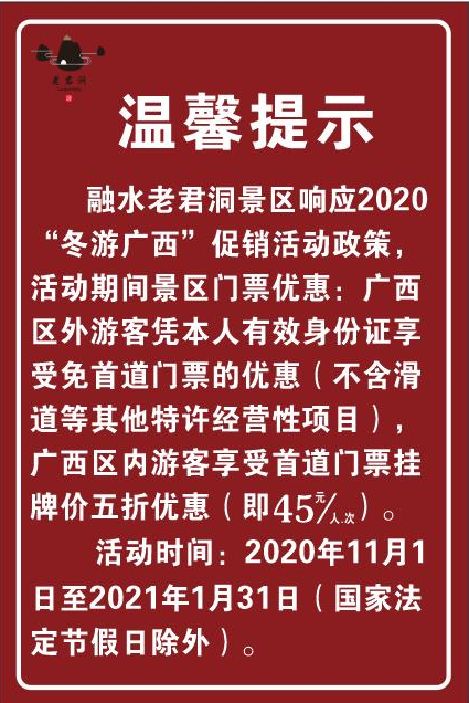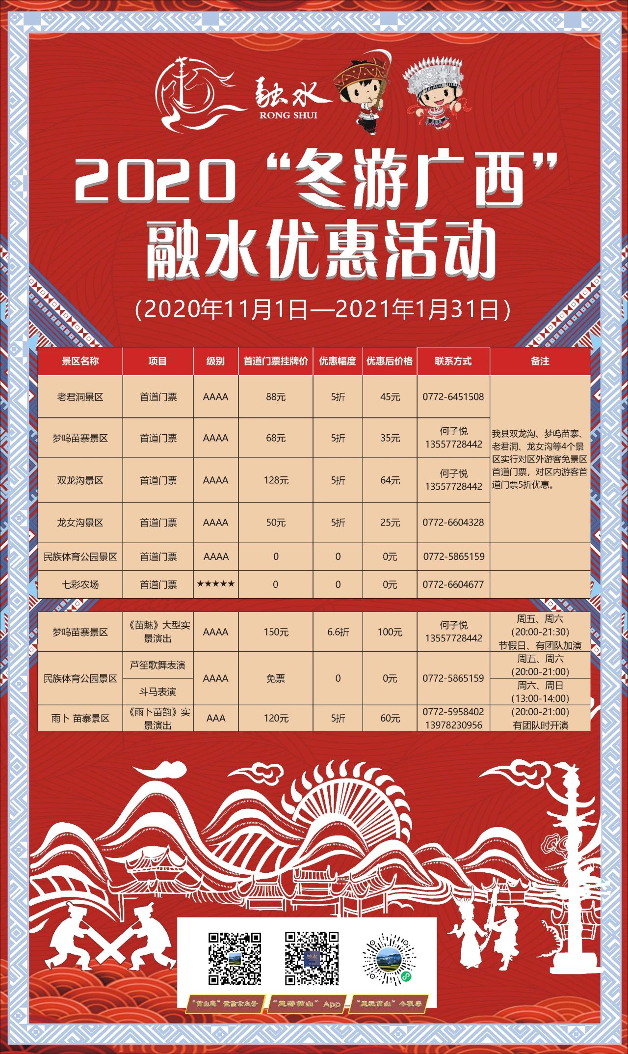 根据《广西壮族自治区人民政府办公厅关于印发2020“山水暖你 壮乡等你—冬游广西”联合促销活动实施方案的通知》(桂政办电〔2020〕238号)文件精神,融水苗族自治县积极开展优惠促销活动。