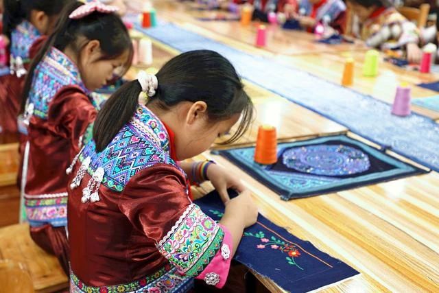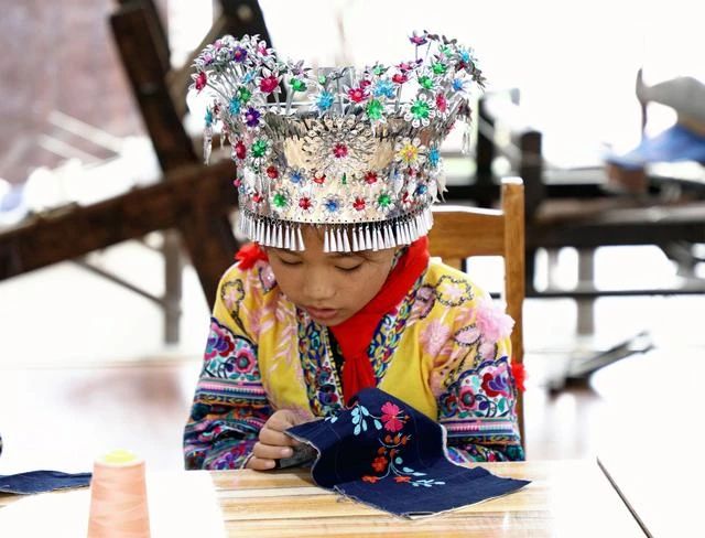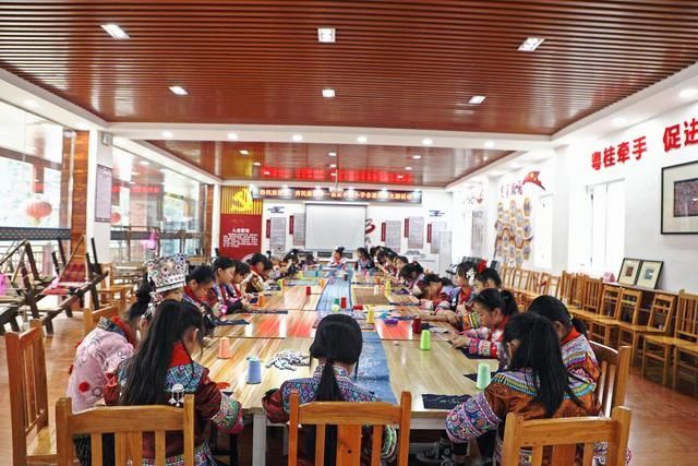 在街区,你会看到新新的吊脚楼,彩云苗艺等。苗寨小镇的小学生,每周都会来到彩云苗艺学习绣花。这些孩子们聚精会神的跟着老师学习。