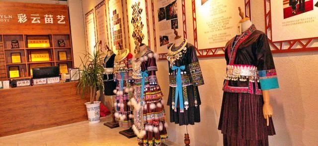 在苗家小镇特色商业街,有一个“苗·巧娘集市”,彩云苗艺。这是由广西柳州彩云苗艺商贸有限公司斥资200万元打造的非遗扶贫就业工坊。建筑面积1500平方米,上下共3层楼,主要是致力于传承传统民族手工艺,弘扬民族文化。