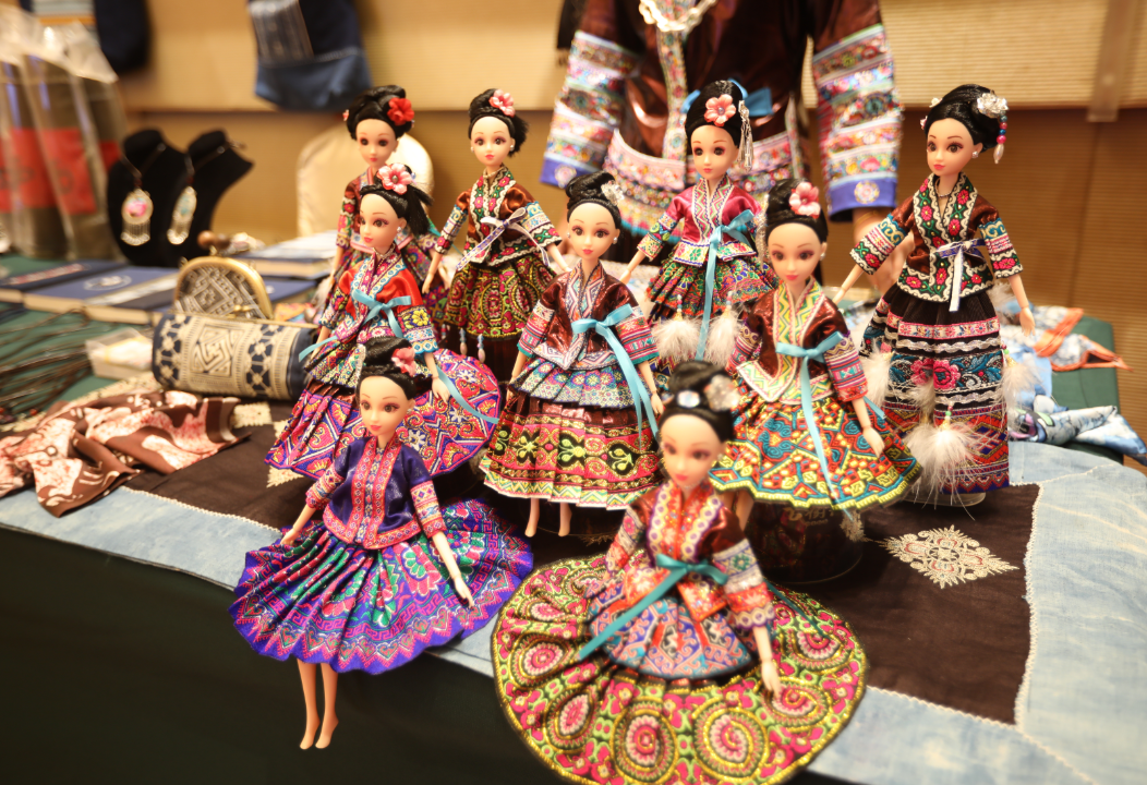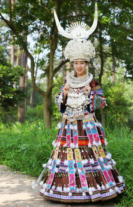 融水民族服饰,以苗族服饰最为彰显。男装只有黑头巾、亮布片和宽脚裤,较为简单。而妇女服饰比较复杂,大多用自织自染自捶成光亮的“亮布”后,缝制衣服时在其衣襟、袖口、头巾、脚套、围裙上面镶上千巧精美的刺绣。穿戴的时候还配上花色多样的银簪、项圈、胸牌、手镯、耳环等首饰。
