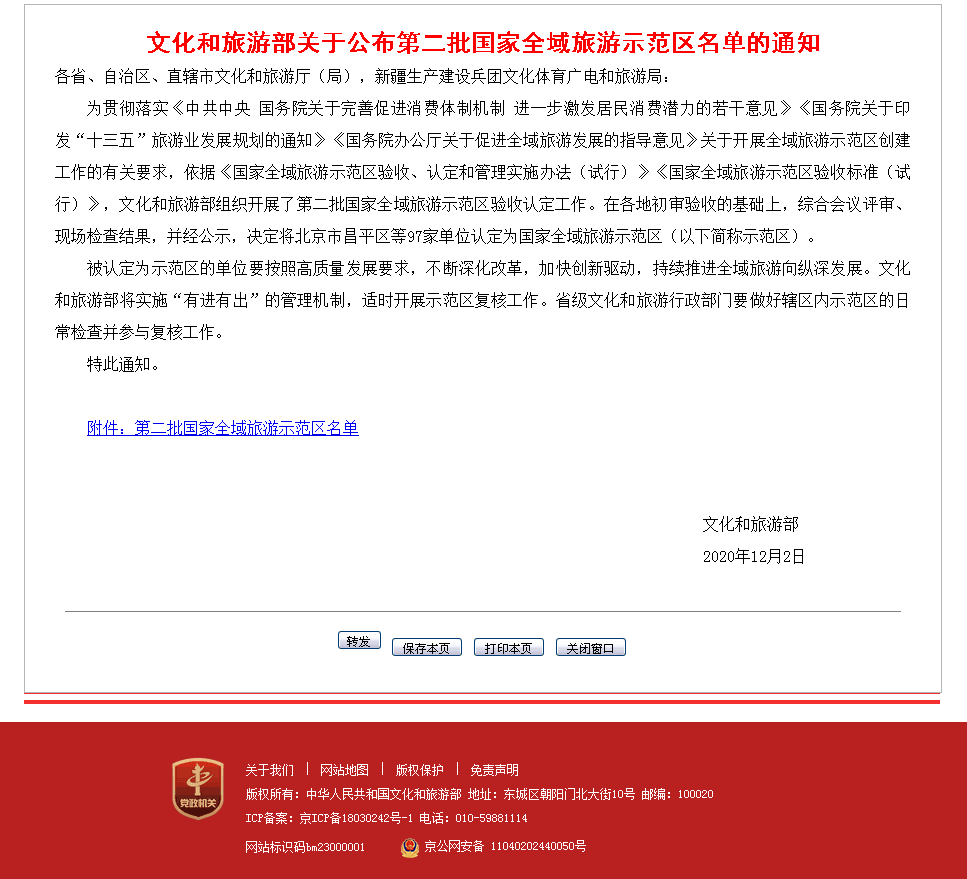 为贯彻落实《中共中央 国务院关于完善促进消费体制机制 进一步激发居民消费潜力的若干意见》《国务院关于印发“十三五”旅游业发展规划的通知》《国务院办公厅关于促进全域旅游发展的指导意见》关于开展全域旅游示范区创建工作的有关要求,依据《国家全域旅游示范区验收、认定和管理实施办法(试行)》《国家全域旅游示范区验收标准(试行)》,文化和旅游部组织开展了第二批国家全域旅游示范区验收认定工作。在各地初审验收的基础上,综合会议评审、现场检查结果,并经公示,决定将北京市昌平区等97家单位认定为国家全域旅游示范区(以下简称示范区)。