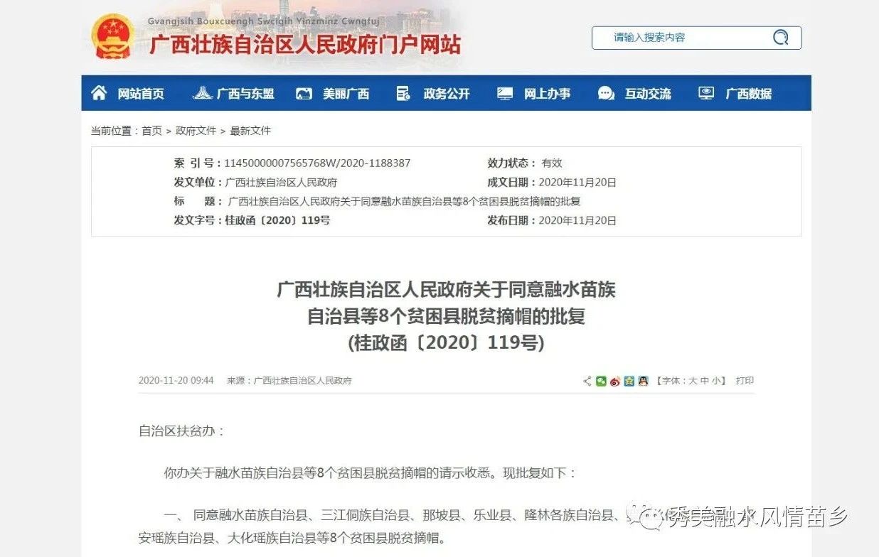 11月20日,广西壮族自治区人民政府发布最新批复文件,同意融水苗族自治县、三江侗族自治县、那坡县、乐业县、隆林各族自治县、罗城仫佬族自治县、都安瑶族自治县、大化瑶族自治县等8个贫困县脱贫摘帽。