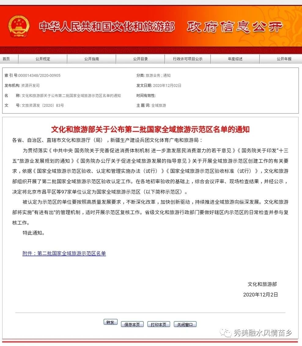 12月2日,文化和旅游部公布第二批国家全域旅游示范区名单的通知称,在各地初审验收的基础上,综合会议评审、现场检查结果,并经公示,决定将包括融水在内的97家单位认定为国家全域旅游示范区。