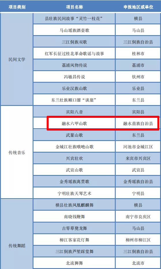 融水苗族自治县入选的项目中有传统音乐、传统体育、游艺与杂技、传统技艺、民俗。