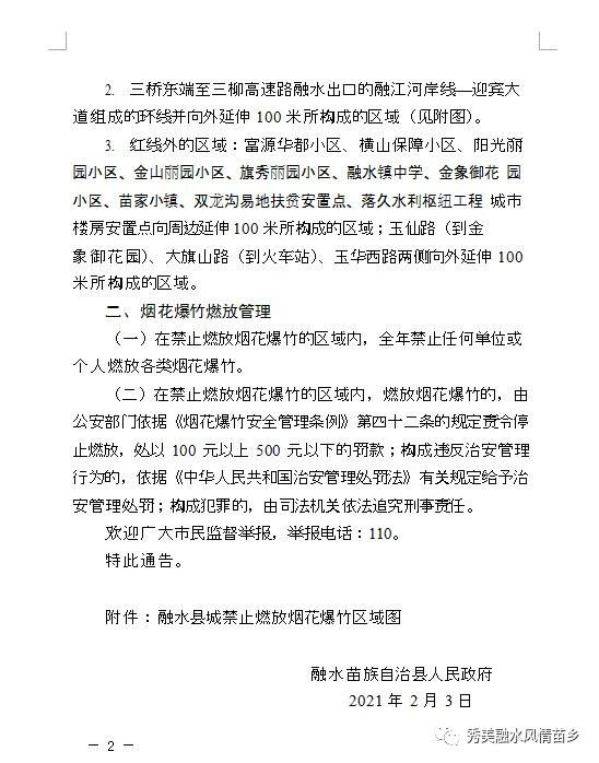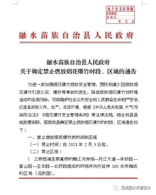 融水苗族自治县人民政府关于确定禁止燃放烟花爆竹时段、区域的通告