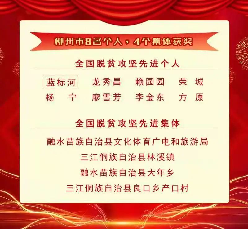 大会对全国脱贫攻坚先进个人、先进集体进行表彰。柳州市一共有8名个人和4个集体荣获全国脱贫攻坚先进表彰。