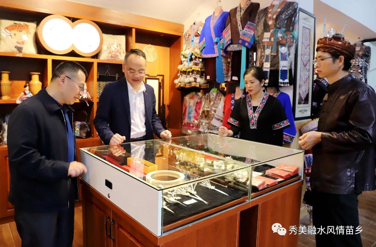 揭牌仪式后,王院忠、贾寒春走进合作社了解融水匠人传统工艺品制作、生产及销售情况。