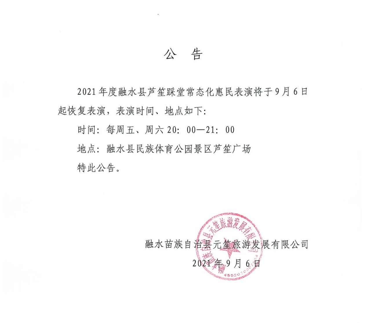 2021年度融水县芦笙踩堂常态化惠民表演将于9月6日起恢复表演,表演时间、地点如下: