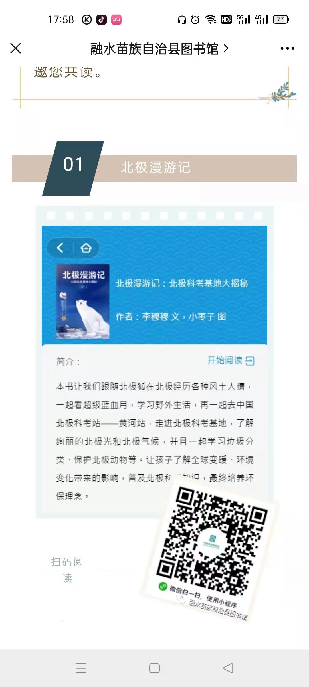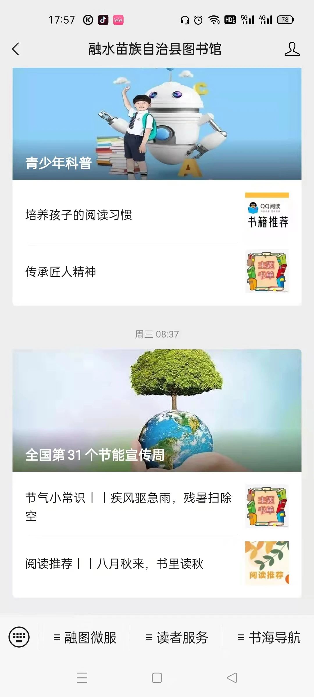 8月, 鉴于当前的疫情防控形势,使得原计划举办的少儿英语辅导班和小学生作文辅导班无法开展,我们转换方式方法,开展内容丰富的线上阅读推广服务。扫“码”阅读、主题书单、阅读获积分”等栏目在微信公众号上推出,把我馆的数字资源以看书、听书、视频等方式提供给读者,让读者体验最舒适的现代阅读模式。