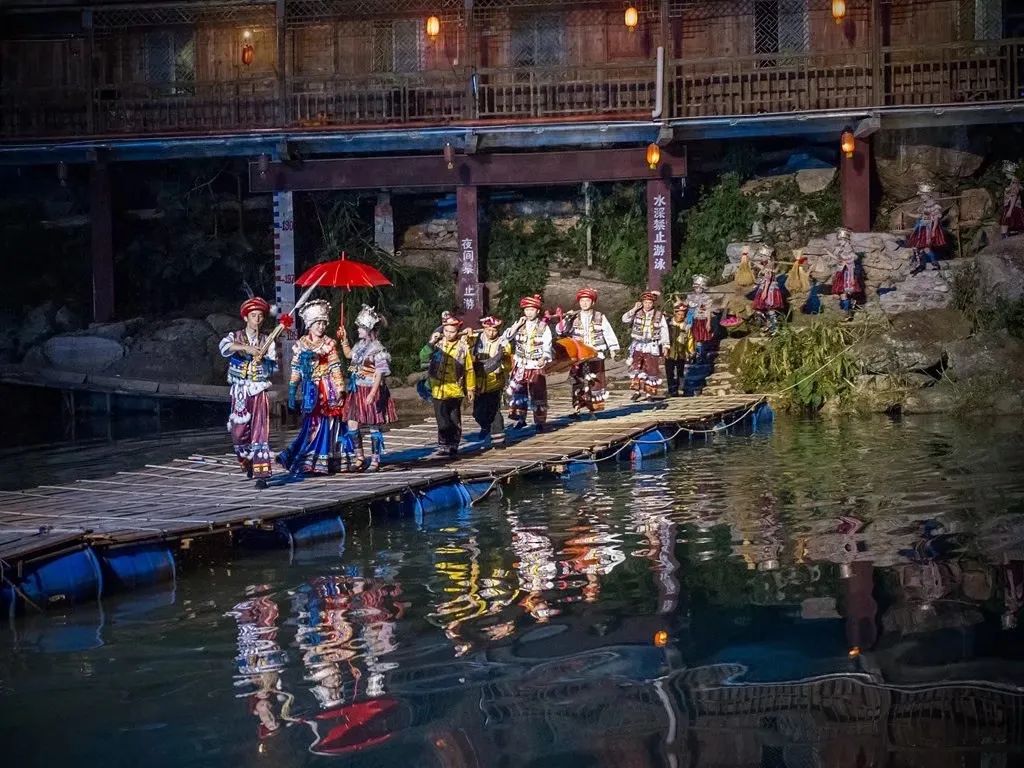 ▶七彩农场→双龙沟景区→梦呜苗寨景区→梦呜苗寨风情街就餐(特色民族菜)→观看大型实景演出《苗魅》→夜宿双龙沟帐篷酒店/梦呜苗寨特色民宿