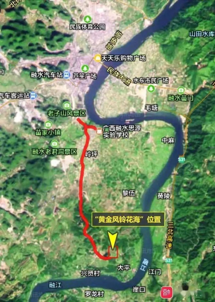 民族体育公园景区(桃花)—水融香轻奢度假茶园(三角梅)—融水镇麻洞屯(油菜花)—融水镇苗门(紫荆花)—融水镇兴贤村(风铃花)—四荣乡荣塘村甲达屯(杜鹃花)
