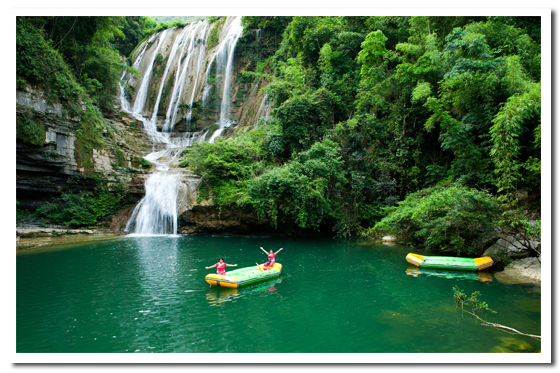 地势造就了九万山内溪流涧水纵横四野,飞瀑流泉随处可见的景观。张家弯一带有一个十几楼高的通天瀑布,十分壮观,而在距张家弯一带五六公里处一个叫猴哭崖的3级瀑布比通天瀑布更为壮观。这里水源呈星芒状放射全区域,并形成3条主要溪谷,汇集成贝江河、中州河、阳江河和东小江河4条河流,先后注入柳江,最后到达珠江出海。数不胜数的深潭,水底的砂砾、成群结队地从岩石下游出来的小鱼、水草清澈见底,一目了然。溪水汇聚于河谷,生成九万山许多壮观的瀑布。