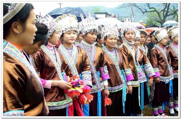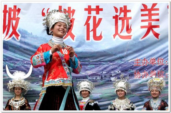 坡上,坚有十多根木制的芦苇笙柱,柱上红纸写着“笙歌声沸春地”,“太平盛世同欢采”表达了苗家儿女的心声。每根芦笙柱都有一支芦笙队围着吹奏、每队三四十人。几百支芦笙齐声起奏声浪如潮、十里可闻。